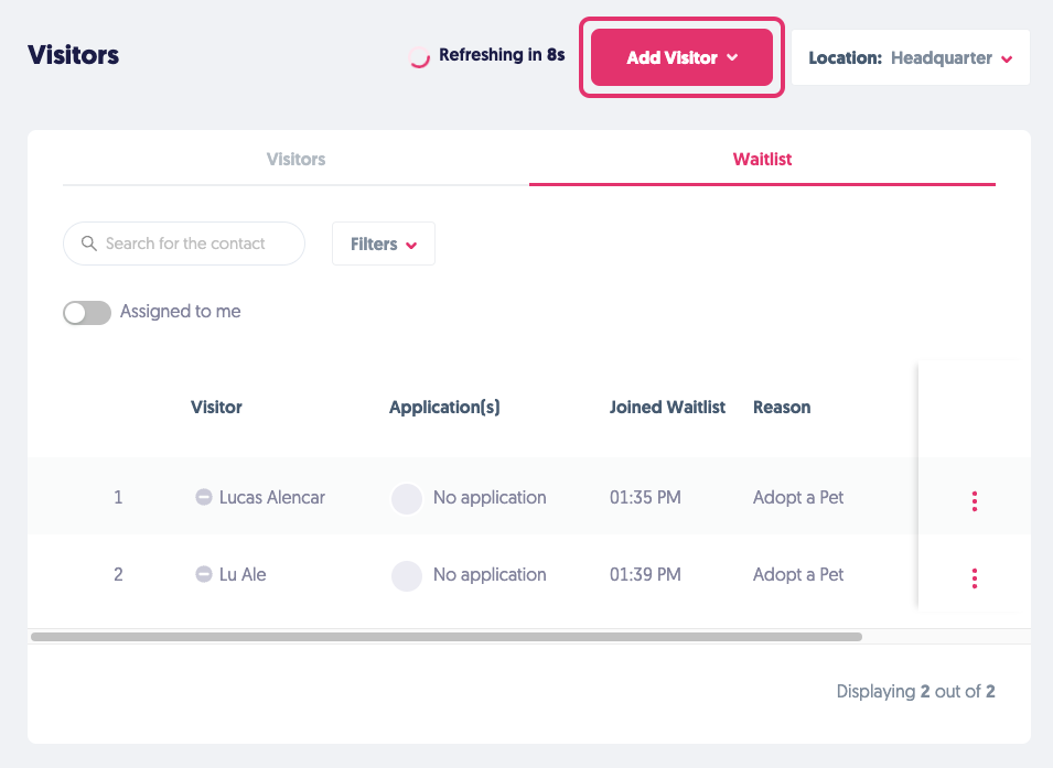 Click on the "Add Visitor" button and select the preferred kiosk inside the Visitors menu.