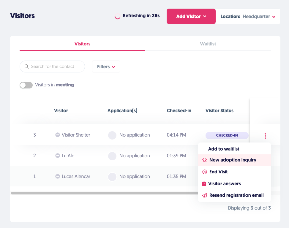 The visitor will show up on the visitor's menu. If you want to create a new adoption inquiry, you can use the dotted button and go on from here.