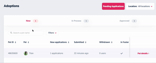 Animals in the "In Process" column have at least one application that is "Under Review," meaning you have at least one potential adopter you are considering for each of those pet. These pets may also have "Pending" applications. To view all pending applications on all of your foster animals, check in two places: in the "New" column and in the "New Applications" section of the "In Process Column."
