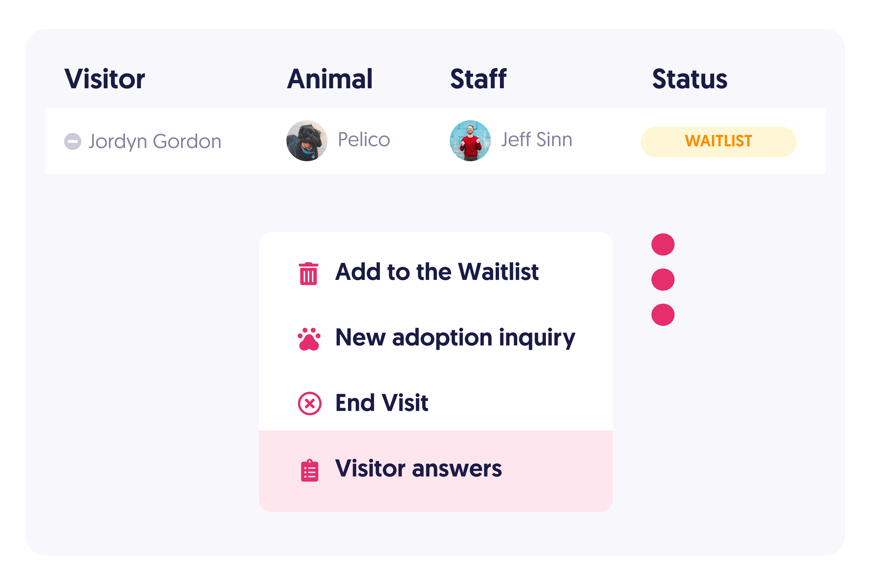 Shelters can now view Kiosk Responses for all visitors. You can access visitors' answers by clicking on the dotted button inside the Visitors menu.